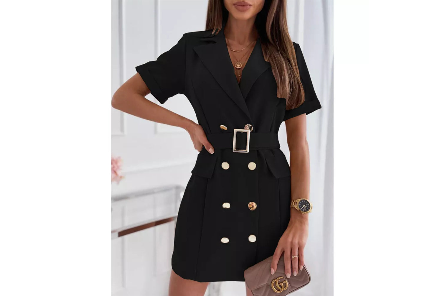 **Double-Breasted Dress with Short Sleeves and a Tailor Collar for a Fitted Waist**