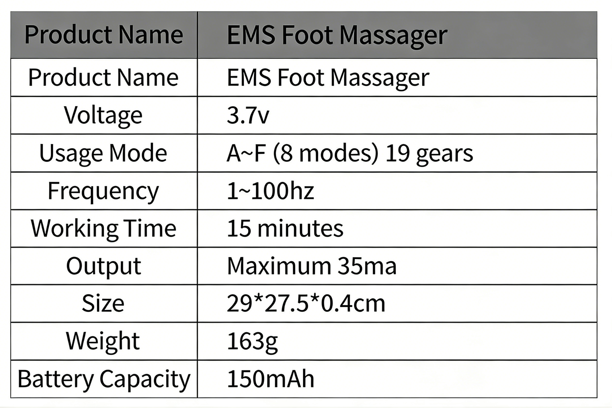 1. This product is a smart EMS foot massager, using microcurrent pulse technology to provide multi-mode massage for the soles of the feet, effectively relieving foot fatigue. It's a foot care tool suitable for home and office use.